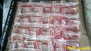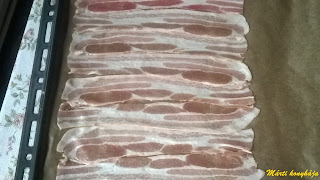 Veszünk egy tepsi méretű sütőpapírt és ráteszünk szép sorban 10 szelet bacon szalonnát.